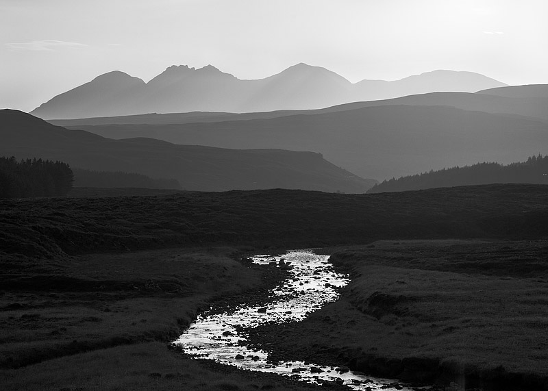The Droma River and An Teallach. I have passed this location on many occasions driving home from Inverness; past Loch Droma just before the Braemore Junction. In almost all conditions of weather and light, An Teallach is a beautiful sight, and on this evening the light reflecting off the river and the hillsides receding to the silhouette of An Teallach were irresistible. Finding the precise location for the composition I had envisaged required a little scrambling and some tricky tripod positioning on a slippery rocky slope – all with an eye on the time before the sun dipped too low to illuminate the river.