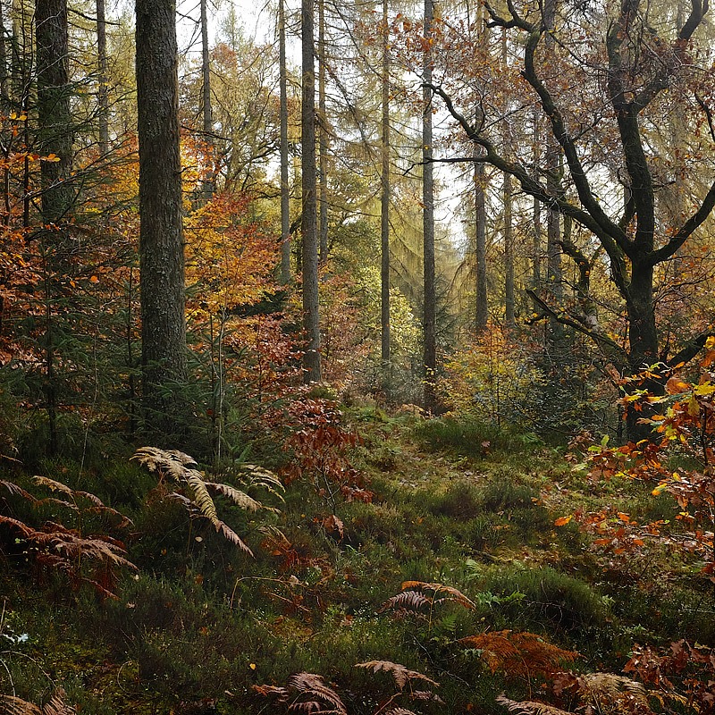 From Umber to Amber I came upon this woodland whilst roaming around near the David Marshall Lodge near Aberfoyle, the day was overcast but the diffused light helped to saturate the autumn colours. I was struck by the contrasts in form between the straight larches and pines and the gnarled beech tree. The hint of a path through the trees added a touch of mystery to the scene.