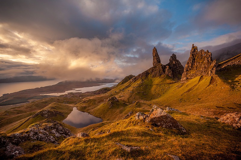 Old Man and Me The original intent had been to catch the sunrise, but the heavy cloud and light drizzle I encountered when I got to the parking place meant that the sunrise was going to be a non-event, but as I’d made the effort to get there I decided to continue the climb up to the Old Man of Storr anyway. Once the sun had climbed high enough to clear the bank of cloud I was rewarded with this beautiful light, making the effort worthwhile.