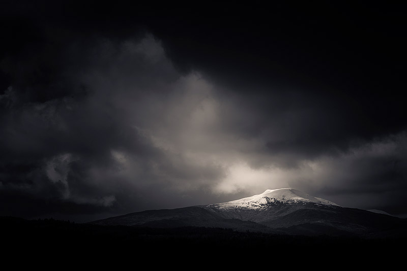 Stob a Ghrianain from Spean Bridge I shot this image during a pit-stop at the Commando Memorial at Spean Bridge. I was admiring the bronzed soldiers view of the mighty Nevis range to the south, the hills encased in a thick layer of snow. As my eye turned west I was stuck by the lovely profile of Stob a Ghrianain rising above a thick strip of pines. The soft and thick cloud formations moving over the scene made for a perfect backdrop to the crisp lines and contrasts created by the strong sunlight and I accentuated the mood in post processing by taking the exposure down to draw you in to the spill of light on the peak.