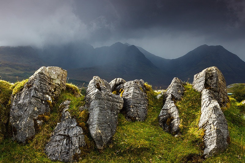 Blaven – Approaching Storm Stormy September weather provided some spectacular lighting conditions during this visit to Skye. On my way to Elgol I stopped here at Torrin and walked up the bank behind the village. Blaven was enshrouded in black clouds but I was rewarded with a brief interlude of bright sunlight between torrential downpours. The foreground was littered with rocky outcrops but I found this pattern of rocks which seemed to mimic the shape of the Cuillin range in the background. I few moments later the storm arrived and I dashed back to the car, soaked but hopeful.