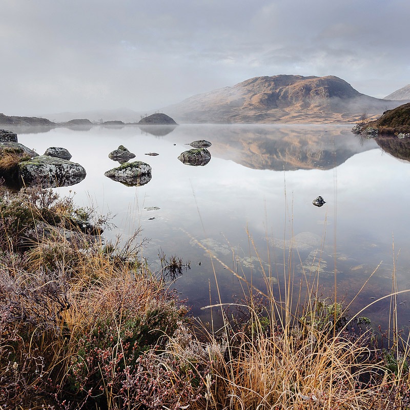 A dawn mist slowly lifts on Rannoch Moor on this almost freezing November morning.