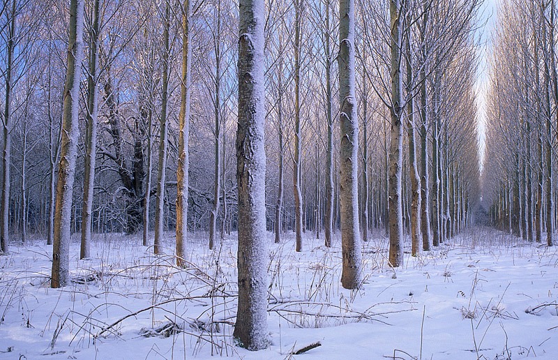 Winter Poplars, Maxton, Scottish Borders The image was taken on a January morning, an hour after dawn. The sun had risen above a neighbouring woodland, lighting up the Poplar trees. I chose a viewpoint looking down through the trees to a distant Holly bush. From this position a Lime tree is visible amongst the Poplars, on the left of the image.