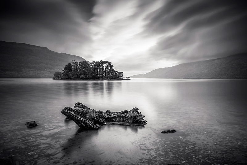 Tarbet Isle A quick stop in a lay by on the A82 passing Loch Lomond followed by a climb over the crash barrier, over a wire fence, down a slippery collapsed wall and a push through the undergrowth got my wife, Jill, and I onto the shoreline. The backlighting behind the Isle was magical but we had to be quick as a tour boat was fast approaching from the left. Jill set up the tripod while I setup the camera for a long exposure. We managed to take the shot just in time, before the tour boats wake ruined the surface of the water and it started to pour down with rain.