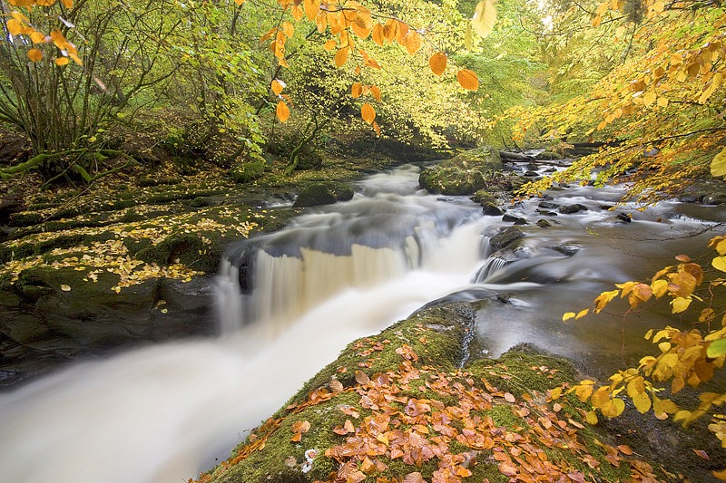 Aberfeldy Autumn Peak Autumn colours and bursting rivulets through the gorge of Aberfeldy Birks after a heavy and prolonged recent rainfall. This scene stood out to me with the abundance of leaves, overhanging canopy and the slicing drop in the river. A steady balance on foot and with the tripod was needed on the very slippy rocks and the use of a polarising filter helped with the water and brought out the naturally saturated colours.