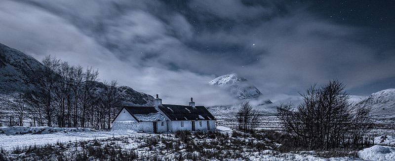 Black Rock Cottage by moonlight Shot on a chilly winter’s night in Glencoe. I woke very early after sampling a share of the sherry cask malt at the King’s House Hotel and was thrilled to find snow falling on Buachaille Etive Mor… Driving wasn’t possible, so I gathered my gear and hiked, still half asleep, to Black Rock Cottage while the stars and clouds danced, then parted, illuminating the famous cottage and iconic mountain. These moments are fleeting and my pulse was racing… I chose a wide aperture, set manually to infinity, and cranked up the ISO, so I could keep the exposure length down and limit the movement in the stars. There was still a real risk of overexposing the snow but Nikon retains great shadow detail, so I underexposed the RAW (to bring the light back into the shadows in Lightroom). Within seconds, the ‘Buckle’ (Buachaille Etive Mor) was shrouded in cloud and the stars had disappeared. One of those occasions when you feel you might have captured a special moment…. The after-glow was still with me as I returned to the King’s House for a hearty “Climbers Breakfast”.