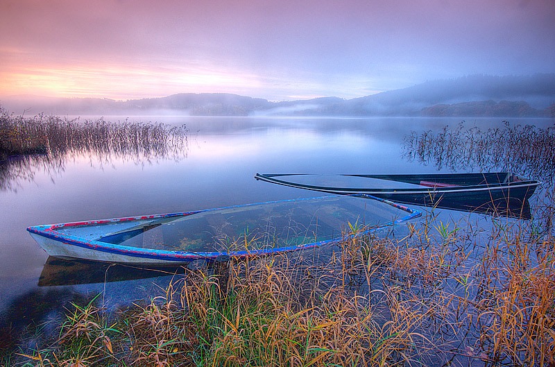 Sunken Boats at Loch Ard I was at Kinlochard at 7.30am on a beautiful October day when I spied these boats. The mist as ever was holding well on Loch Ard giving a tremendously tranquil feel to the morning as I waded in to a good vantage point and held my breath till the ripples subsided.