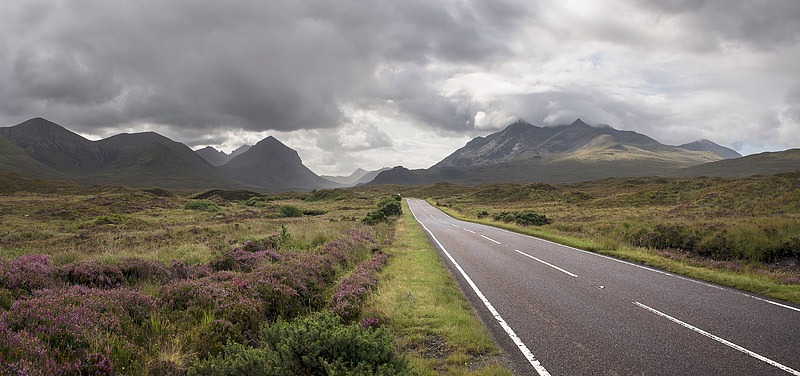 Skye Escape I took this panoramic shot near Sligachan, Isle of Skye on my way back to Inverness after photographing Old Man of Storr at sunrise. I like to include roads in my photographs as they add sense of travelling, adventure and also lead eyes through the image. I decided to create panoramic image made of three single shots stitched together to include most of the mountains on horizon. I was trying to catch ‘that’ moment when all elements come together – the light and shadow, mix of heavy clouds and sunshine breaking through, vibrant colours of the moor and blooming heather – a fascinating combination specific for Scottish Landscapes.