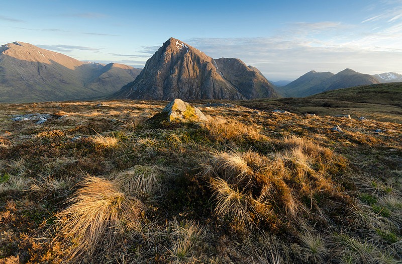Allan Wright – The Buachaille Etive Mor This iconic mountain offers infinite photo possibilities and on this occasion I chose to return to the spot I first shot The Buachaille from back in 1993 i.e. from Ben a Chrulaiste. My timing was seemingly on the nail as the texturally rich foreground glowed momentarily from the last rays of summer sunshine falling across this magnificent Glen. The little outcrop in mid distance adds a touch of lyricism as it mimics the familiar profile of this “Great Shepherd of the Glen”