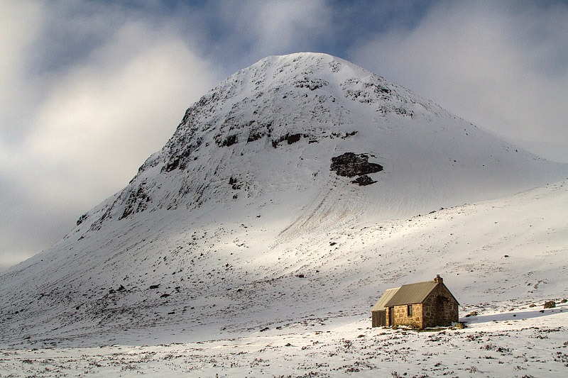 Bothy Trails and Tales Corrour Bothy sat beneath The Devils Point, Cairngorm National Park. Shot was taken in the morning after spending the night at the bothy. The light breaking through the cloud lit up the bothy brilliantly whilst an avalanche cracked and crashed it’s way down the mountain’s steep face.